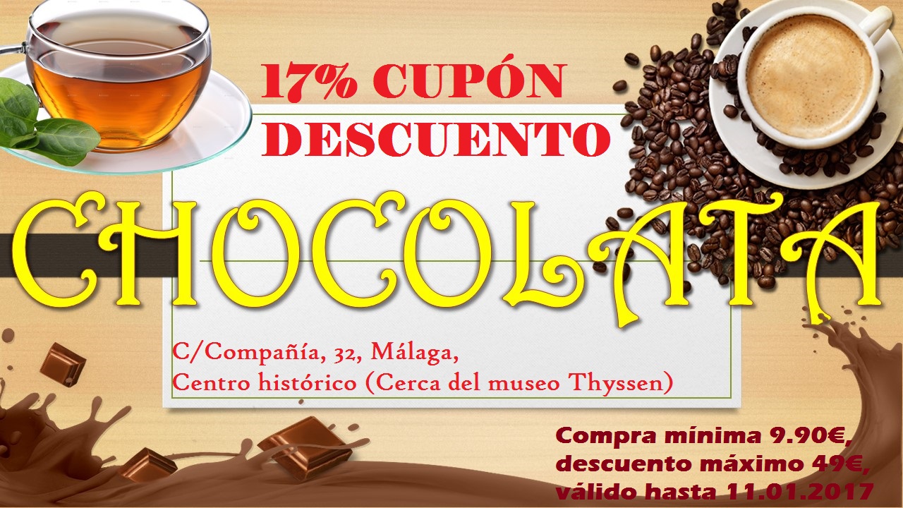 Imprime o muéstranos este cupón desde tu dispositivo móvil y obtendrás el 17% de descuento en todos nuestros productos.Visítanos en calle Compañía, 32 en el centro histórico de Málaga.
